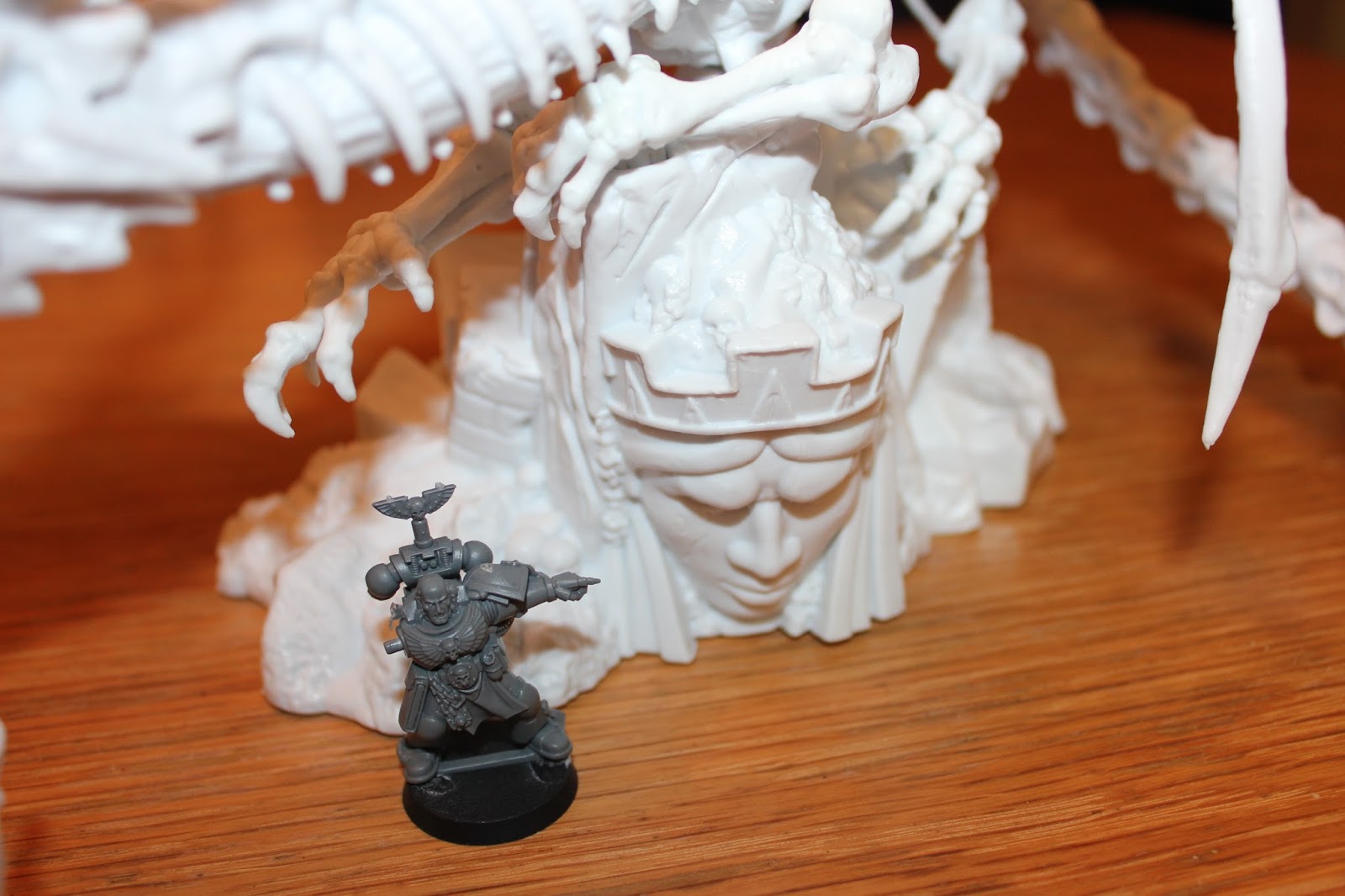 Here we have the model just push assembled. Not glued, cleaned or straightened. The space marine sergeant is provided for scale purpose. You can see the model is very large. It is actually larger than they intended it to be. Apparently there was a conversion error between the sculpt and mold production that lead this model to be upscaled.